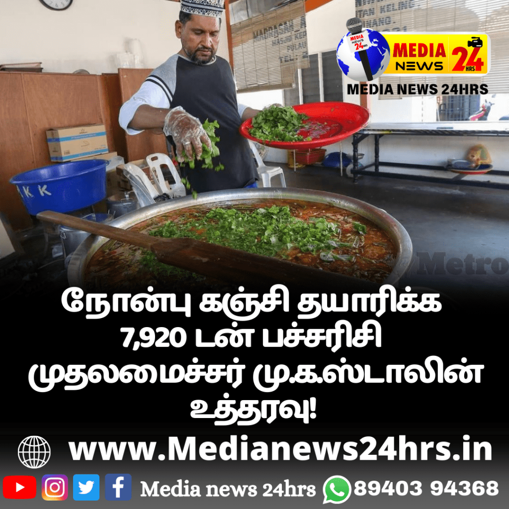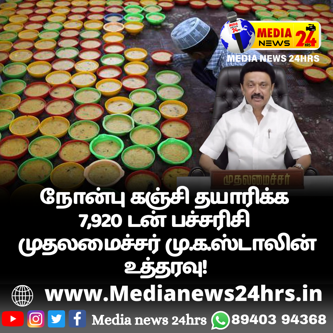ரமலான் நோன்பு கஞ்சி தயாரிக்க பள்ளிவாசல்களுக்கு 7,920 டன் பச்சரிசி வழங்க முதலமைச்சர் மு.க.ஸ்டாலின் உத்தரவிட்டுள்ளார். இது தொடர்பாக வெளியிடப்பட்டுள்ள அறிக்கையில் கூறப்பட்டுள்ளதாவது,